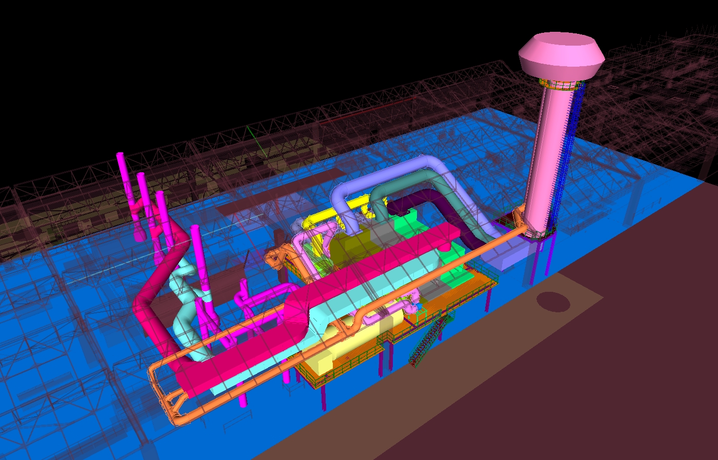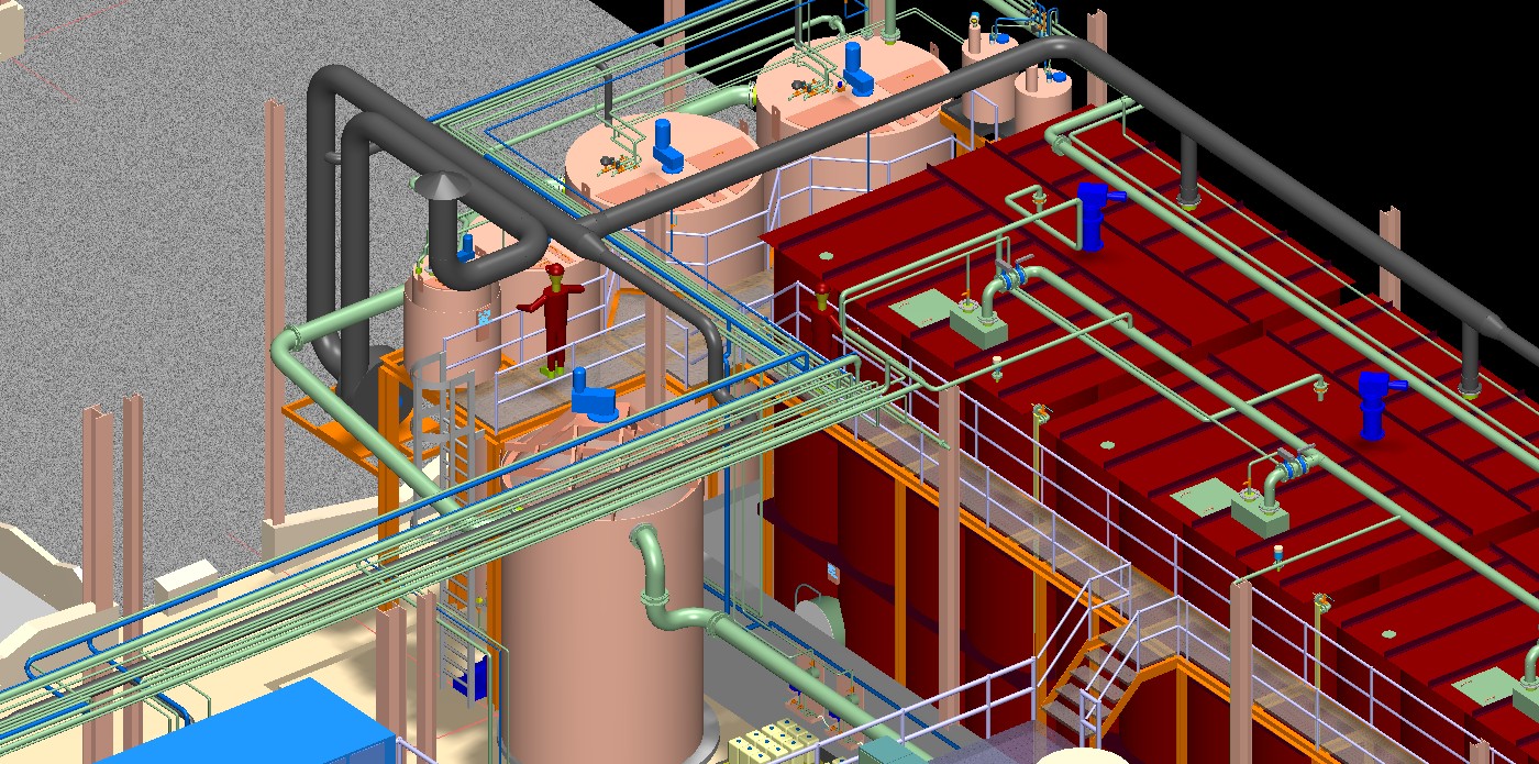 3D CAD Digitale Fabrik und LayouterstellungWir nehmen Ihren Bestand incl. des Gebäude vor Ort auf. Die Modellierung der Anlagentechnik erfolgt in der Regel mit Microstation und den TRICAD MS Modulen Fördertechnik, Stahlbau, Heizung, Sanitär, Lüftung, Elektro.Neuanlagen planen und konstruieren wir lagegerecht und entsprechend Ihrer CAD Richtlinien. Die Detailtiefe geben Sie vor. Wir überprüfen unsere Planung mit NavisWorks auf Kollisionen. Sie erhalten von uns Layouts, Verfahrensschemata, Aggregateaufstellpläne, Verrohrungspläne, Belastungspläne, Anschlußpläne Elektrik, Fundamentpläne, Sicherheitslayouts etc. Beispiel TGA (3D Detailplanung der Verrohrung, Erstellung von Stücklisten, Montageplänen etc.)